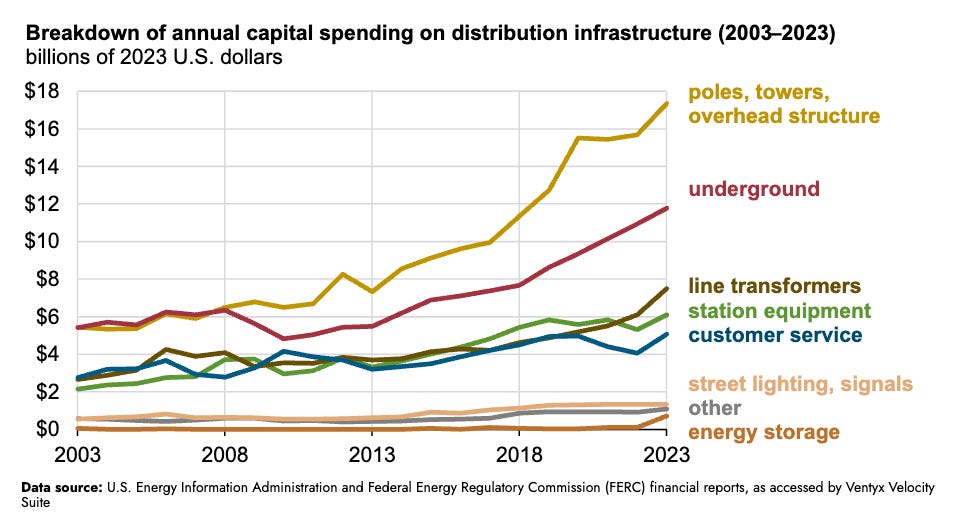 Yet even this massive spending isn’t keeping pace with needs. Investment in line transformers increased 23% from 2022 to 2023, partly due to supply chain issues causing replacements to be needed more frequently. Spending on distribution substation equipment has increased 184% since 2003—necessary to help utilities withstand extreme weather, manage renewable intermittency, and allow greater voltage control during emergencies.